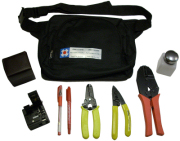 Description: Fiber optic mechanical connector tool kit. Includes fiber cleaver, cleaner container, fiber stripping tool, wire stripping tool, ratcheting hex crimp tool, fine point marking pen, broad tipped marker & carrying case.