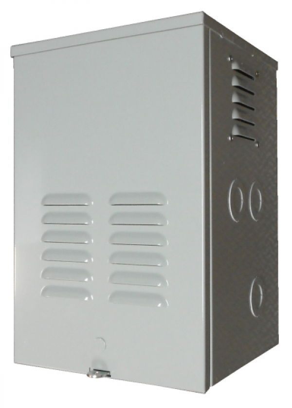 Description: Metal enclosure with plywood backing, 18 inches high x 12 inches wide x 11 inches deep, inlcudes grounding lug, hasp for a padlock, lift off door, vents and knockouts