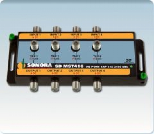 Description: Four port coaxial satellite tap, four separate inputs with four loop pass through ports and four tap ports, 5-2,150 MHz, 16 dB tap loss