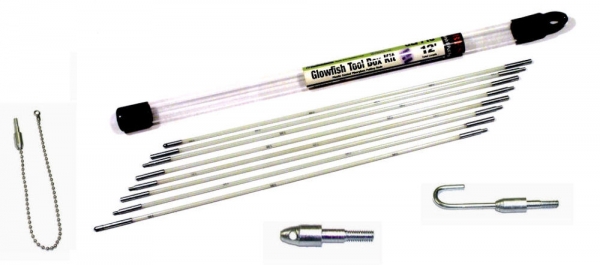Description: Glowfish II 5/32 Inch Diameter, Plastic Coated, Glow-in-the-Dark, 18 Inch Tool Box Kit, Plastic Coated Glowfish Glow-in-the-Dark Rods, Compact kit fits in your tool box, bag or suit case, Super Flexible - Great for tight jobs, Durable plastic coating which greatly reduces splintering and slivering of fiberglass, No More Splinters!!, Kit Contains 12 total feet: 1 - 18\\\\\\\" B/F, 7 - 18\\\\\\\" M/F rods, Durable zinc-plated, rustproof, machined steel end fittings, Perfect for a wide range of installation situations and challenges, Kit comes packaged in a handy, clear carrying case with vinyl caps, Accessories Included: Bullnose Tip, Fish Hook and Ball Chain.
