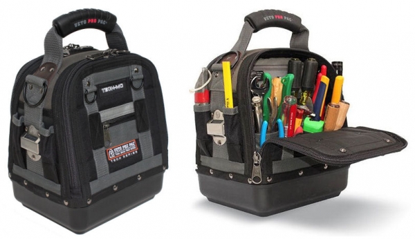 Description: M Series Tool Bag, Vertical Tool Pockets: 38 interior and exterior tool pockets of various sizes, 2 Storage Bays, Hand Tools on one side, Meter and Drill Storage on the other side, 2 Neoprene Pockets on Meter Side, D-Rings: 2- 2 inch and 5- 1 inch, Outside Mounted Stainless Steel Tape Clip Holder, Quick Access Pocket for Drill Bit Extensions and Small Items, Width: 8 inches, Length: 10 inches, Height: 12 inches (10 inch Inside Vertical Storage for Long Shank Tools), Weight (empty): 5 lbs.