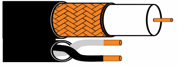 Description: RG-59 Video cable with attached 18/2 power cable, black jacket, 500' reel-box, solid copper center, copper clad braid, and power cable.