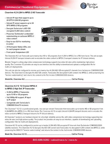 satellite receivers. The Clearview 4:2 12 decrypts the AES-128 content and Transcodes the decrypted H.264 content into MPEG-2, while