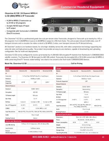 satellite receivers. The Clearview 4:2 SD decrypts the AES-128 content, Transcodes the decrypted HD or SD H.264 content into SD MPEG-2,
