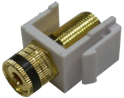 Description: Keystone style snap in speaker wire binding post, white plastic, black band