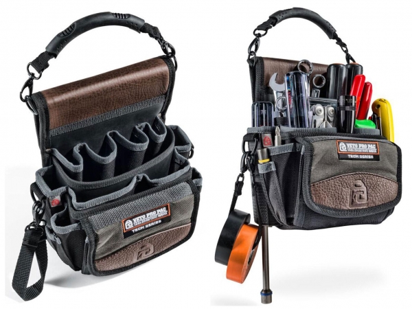 Description: Tech Series Tool Pouch, Vertical Tool Pockets: 20 interior and exterior, Includes 2 Vertical Long Shank Side Tool Pockets, D-Rings: 2 small, 8 inch Electrical Tape Strap, Width: 7 inches, Depth: 4.75 inches, Height: 9.5 inches.