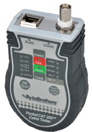Description: Pocket Cat, pocket RJ45 and coaxial cable tester. The perfect tester for both Ethernet (RJ45) and coax cables. Ruggedized and cushioned for field use. Ethernet test is a complete TIA568 test for opens, shorts, crosses and split pairs. Bright blue LEDs instantly render the PASS/FAIL results. A built-in, hidden drawer stores the remote wiremap adapter. Includes a tone generator compatible with most tone probes.