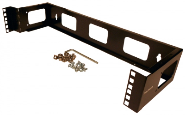 Description: Wall mountable rack, hinged, two space 3.5 inches high, 6.5 inches deep, includes cage nuts and rack screws, black finish