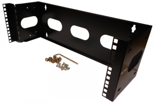 Description: Wall mountable rack, hinged, four space 7 inches high, 6.5 inches deep, includes cage nuts and rack screws, black finish