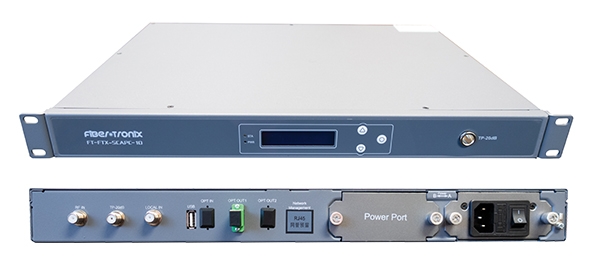 Description: Rack mountable broadband RF fiber optic transmitter, 1310nm, single-mode, 47-860 MHz, 10 dB Optical output, SC/APC fiber output connection, 12-22 dB input level, front panel control and monitoring.