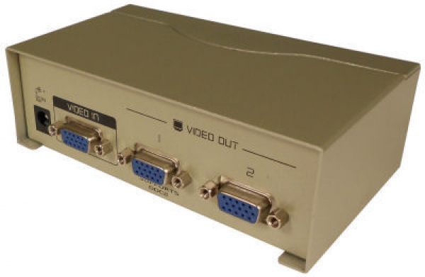 Description: 1 x 2 VGA splitter, Designed to splits a single VGA 15 pin source to two VGA 15 pin displays. Power supply included.