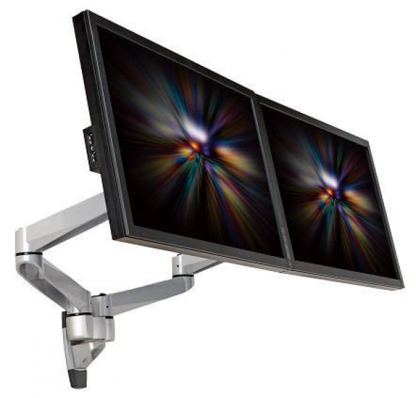 Description: Two Monitor Dual Swivel Arm Wall Mount, Wall Mountable, 75 x 75 100 x 100 VESA Pattern, Dual color finish, silver/black, 0 Lift, 360° Pivot, 360° Swivel, 360° Pan, 105° tilt, Pole Length 84.5mm