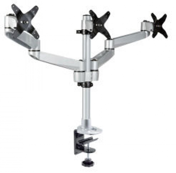 Description: Three Monitor Dual Swivel Arm Monitor Mount, C-Clamp or Grommet/Hole Mount, 75 x 75 100 x 100 VESA Pattern, Dual color finish, silver/black, 330mm Lift, 360° Pivot, 360° Swivel, 360° Pan, 105° tilt, 420mm extension, Pole Length 502mm