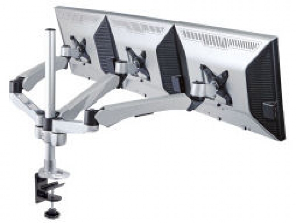 Description: Three Monitor Dual Spring Arm Monitor Mount, C-Clamp or Grommet/Hole Mount, 75 x 75 100 x 100 VESA Pattern, Dual color finish, silver/black, 330mm Lift, 360° Pivot, 360° Swivel, 240° Pan, 105° tilt, 540mm extension, 270mm vertical, Pole Length 502mm