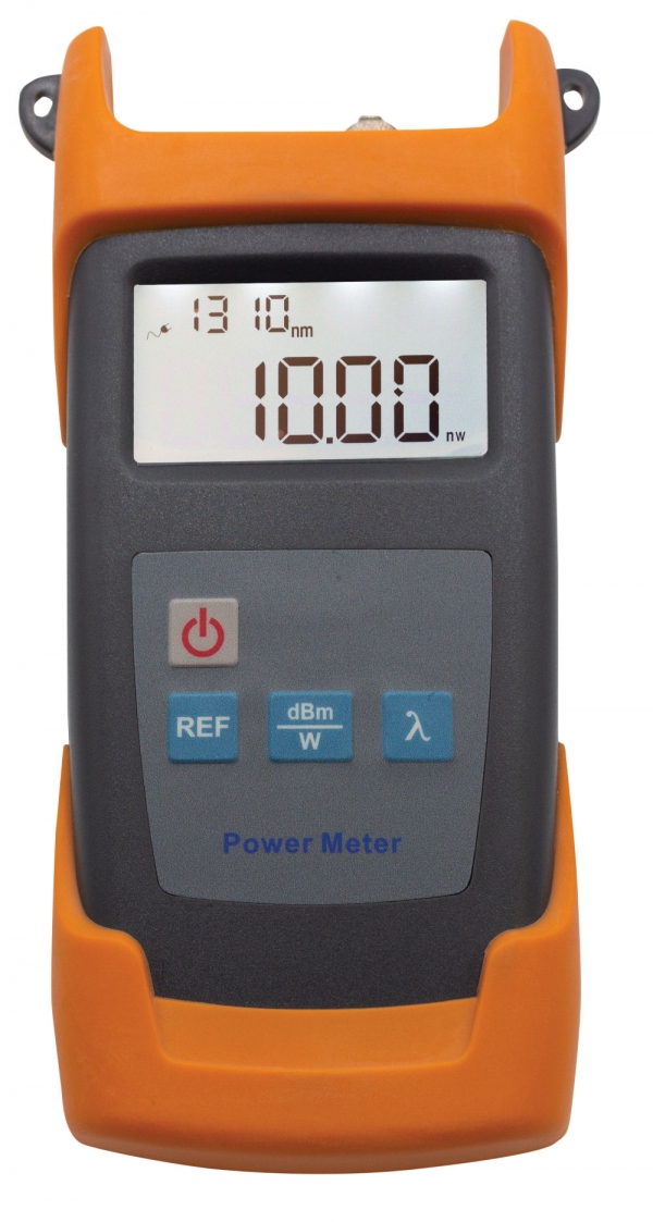 Description: Discontinued - Handheld optical power meter, 800-1700nm, with FC/APC, ST/APC & SC/APC connector adapters, Wide dynamic measurement range, Reference power level storage, User self-calibration function, LCD display and backlight LCD display supports night operation, Power measurements in dBm or mw and insertion loss in dB, Auto-off function can be activated or deactivated, Runs on AA alkaline batteries, Low battery indication.