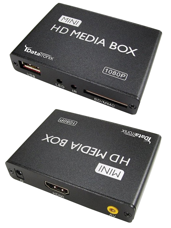 Description: The DataTronix Mini Digital Signage Players allow you to display user created presentations that are informative and entertaining. These simple plug-n-play devices are capable of presenting full-screen slideshows and videos on any HDMI input monitor. The Mini Digital Signage Player displays media files from a USB storage device or SD card, and does not require internet connectivity. Simply load your image, audio, or video files onto a flash drive and connect it to the Mini Digital Signage Player. The size of your presentation is only limited by the storage space of your USB device.