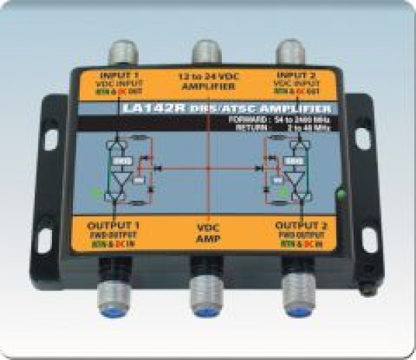 Description: 2 Line Satellite amplifier, 14 dB Gain, 7 dB slope, 54-3000 MHz forward with 2-40 MHz return path, power supply not included.