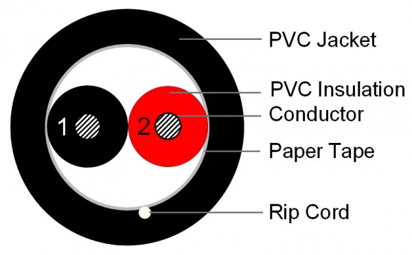 Description: DISCONTINUED: 2 Conductor, 14 gauge, stranded direct burial cable, ETL Listed, CMR/CL3R Oxygen free bare copper stranded conductors, Black PVC Sunlight resistant jacket, 500 foot pull box