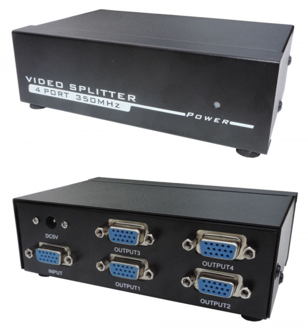 Description: Designed to split a single VGA source to four VGA destinations, 5VDC, 1A Power supply included, 15 Pin VGA/SVGA, 350 MHz Bandwidth, Input level 0.5 - 1V, Output impedance: 75 Ohms, Maximum video resolution 1920 x 1440 at 60Hz, Transmission distance 200’, Supports DDC, DDC2 & DDC2B functions, Hot plug in capable, Rugged metal housing, Supports VGA, XGA, SVGA, UXGA, WUXGA and multisync display, Suitable for wide screen LCD displays and big screen LCD TVs