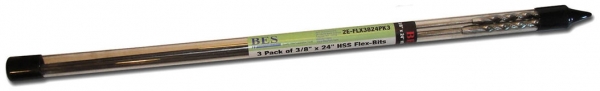 Description: 3 Pack - HSS Flex Bit 3/8 inch Diameter drill bits, 24 inch Long, Convenient 3 Pack, Reusable plastic tube safely protects your bits from damage, The tube also protects you from accidental cuts, Added convenience of having a spare bit on hand, Savings up to 10% based on buying individual bits, Aggressive 118 degree cutting tip drills fast, clean holes, Fast spiral flutes improve debris removal and reduce drag, Premium M2 grade steel stays sharp longer, Two Piece Construction - allows for a harder bit and a more flexible shaft, Cuts through Wood, Metal, Nails and Screws, Beveled shanks for improved grip in all drill chuck.