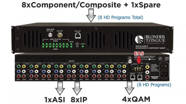 Description: The HDE-8C-QAMIP (MPEG-2 HD Encoder: 8xComponent/Composite to 4xQAM/8xIP) accepts up to eight analog programs from any of the following inputs: 8xComponent and 8xComposite and provides simultaneous QAM and IP outputs. The encoder is equipped with a spare input (9th input) to replace any one of the primary eight inputs in the event of a failure.