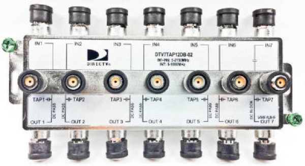 Description: Seven input coaxial tap designed for DIRECTV L-Band backbone systems, 6 Satellite inputs (5-2150 MHz), 1 UHF/VHF input (5-1000 MHz), 35 dB port to port isolation, 7 inputs, 7 through ports and 7 tap off ports, 6 dB tap port loss
