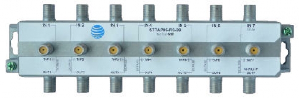 Description: 7 Port tap, Six satellite inputs at 250-2150 MHz, One Terrestrial input at 5-1000 MHz, 20 dB tap loss, Two ground lugs, DC Power passing from output to input, DC Power blocking on tap ports, For indoor use only, Wall mountable.