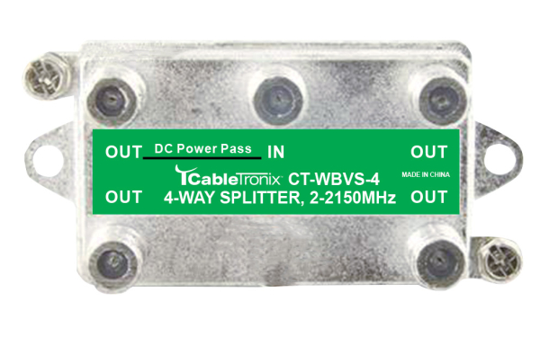 Description: Wideband / SWIM RF Coax Splitter, Single Input, Four Outputs, One Output Marked DC Passing, Vertical Port Alignment, 2-2,150 MHz CableTronix high-performance wideband splitters are designed to operate across a frequency range of 2-2,150 MHz, ensuring superior signal distribution for a variety of applications. Available in both two-output and four-output configurations, these splitters feature one DC passing port for power to remote devices. Ideal for satellite, CATV, and broadband systems, they have exceptional reliability and low insertion loss, making them an essential component for efficient signal management. Dimensions: 3.3 inches x 2.2 inches x 1.4 inches