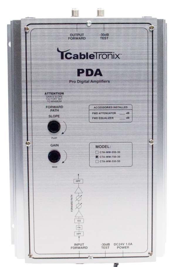 - 10 dB adjustable slope control – compensates for frequency-dependent tilt in long coaxial cable installations